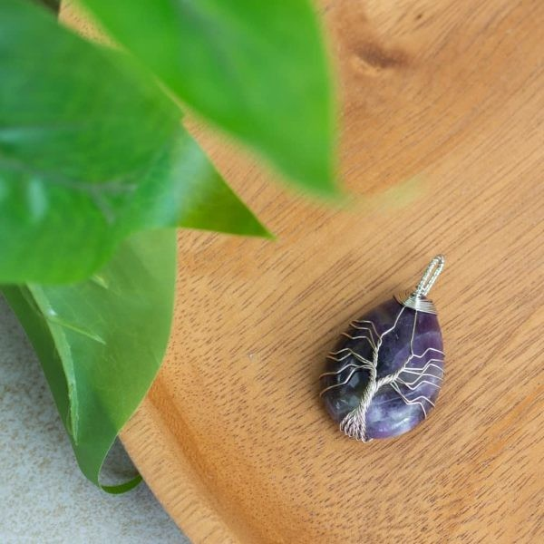 Un Pendentif comprenant une pierre précieuse Améthyste entourée d’un arbre de vie. Celui-ci est fabriqué à la main.
